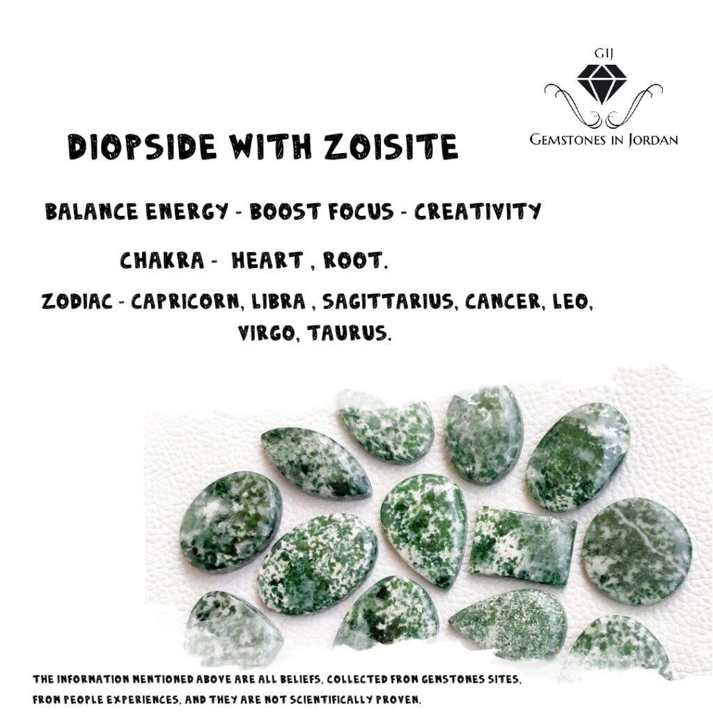 يزداد الطلب على حجر Diopside with Zoisite (الزيزستيك مع الديوبسيد) في الأردن، خاصة في عمان، لما له من جمال طبيعي نادر وفوائد متعلقة بالطاقة والتوازن. ويُعرض في المتاجر المتخصصة في الأحجار الكريمة، منها gijstore.com، حيث نوفر أحجار طبيعية مختارة بعناية للعملاء داخل الأردن.